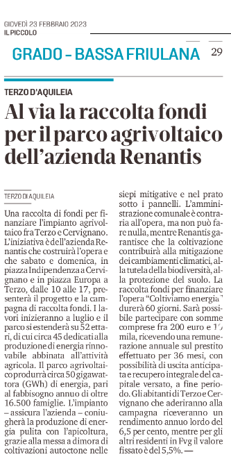 Terzo d'Aquileia - Al via la raccolta fondi per il parco agrivoltaico dell'azienda Renantis