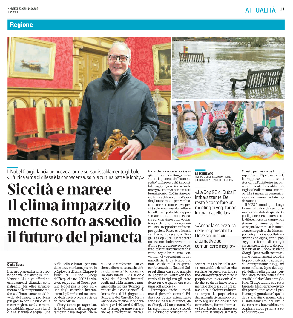 Il Nobel Giorgio lancia un nuovo allarme sul surriscaldamento globale «L'unica arma di difesa è la conoscenza: solo la cultura batte le lobby»