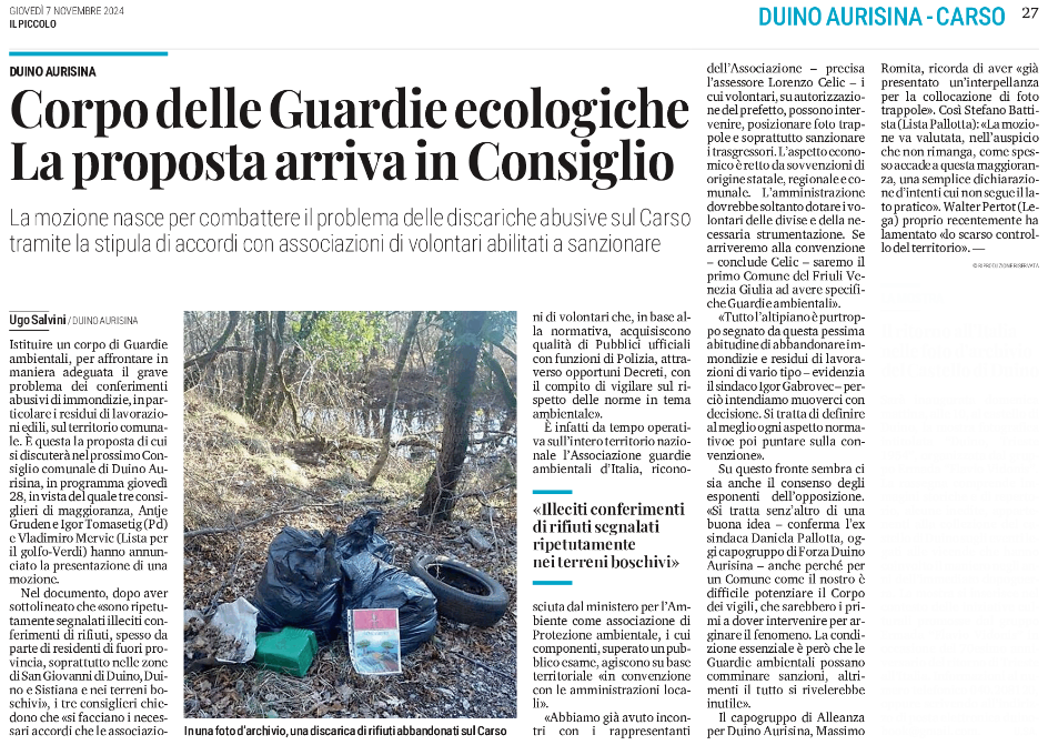 Duino Aurisina - Corpo delle Guardie ecologiche La proposta arriva in Consiglio