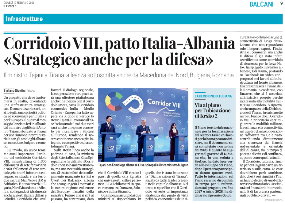 Corridoio VIII, patto Italia-Albania «Strategico anche per la difesa»