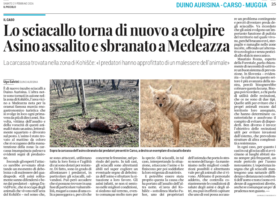 Lo sciacallo torna di nuovo a colpire - Asino assalito e sbranato a Medeazza