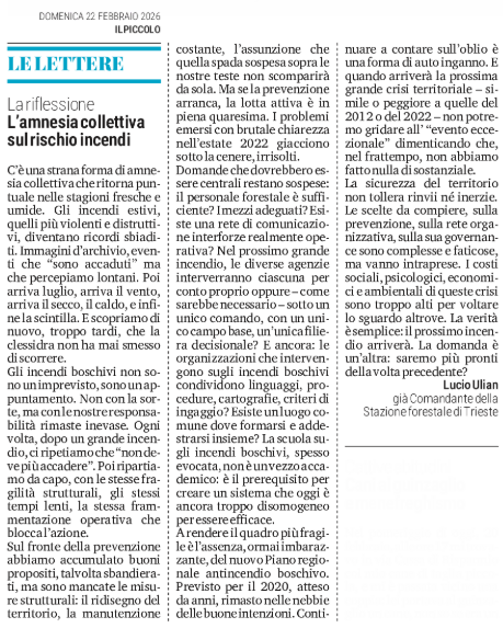 SEGNALAZIONI - La riflessione - L'amnesia collettiva sul rischio incendi - (Lucio Ulian - già Comandante della Stazione forestale di Trieste)