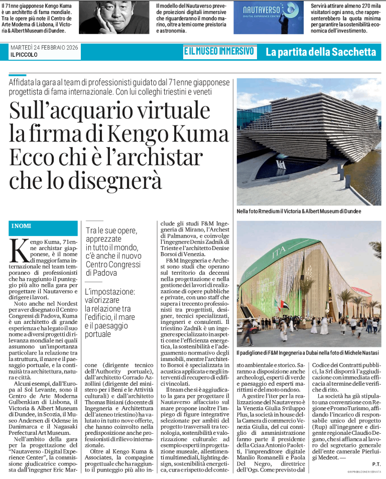Affidata la gara al team di professionisti guidato dal 71enne giapponese progettista di fama internazionale. Con lui colleghi triestini e veneti