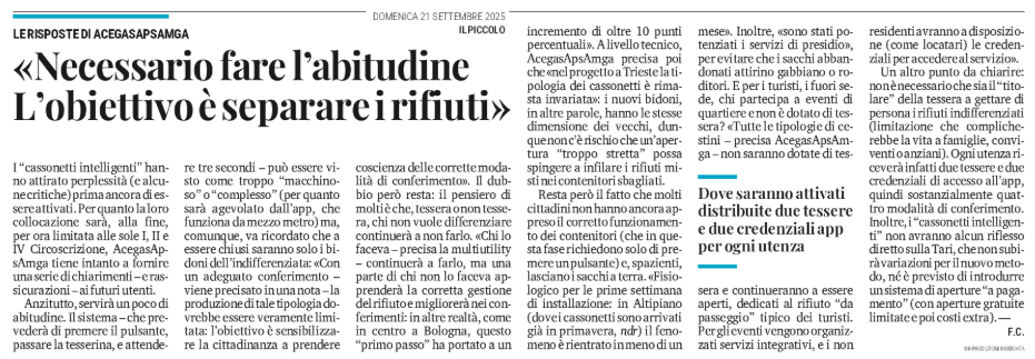Le risposte di AcegasApsAmga «Necessario fare l'abitudine. L'obiettivo è separare i rifiuti»