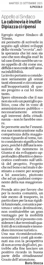 SEGNALAZIONI - Appello al Sindaco - La cabinovia è inutile. Dipiazza ci ripensi - (Boris Stocca)