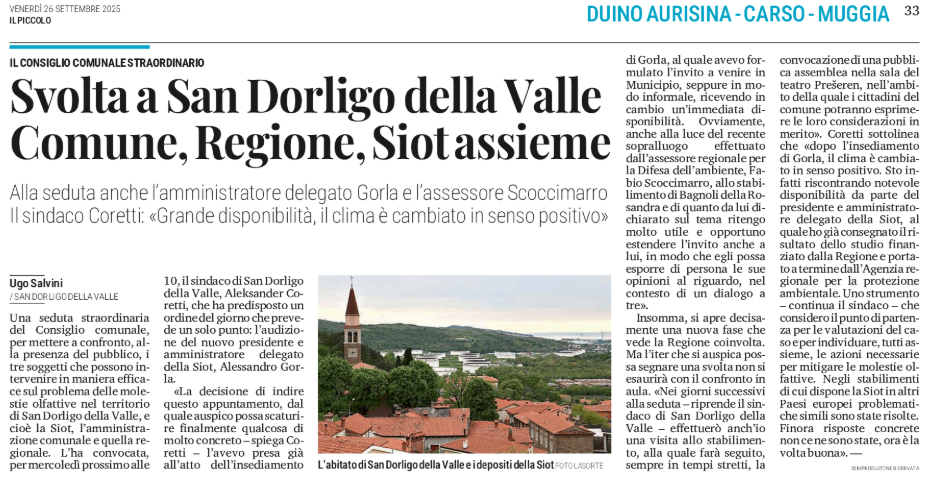 MOLESTIE OLFATTIVE - Svolta a San Dorligo della Valle Comune, Regione, Siot assieme - il consiglio comunale straordinario