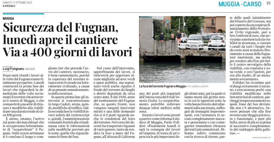 Muggia - Sicurezza del Fugnan, lunedì apre il cantiere - Via a 400 giorni di lavori