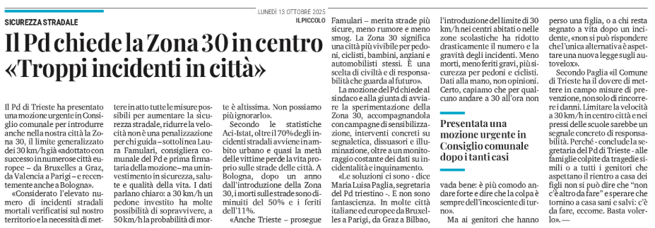 Sicurezza stradale - Il Pd chiede la Zona 30 in centro «Troppi incidenti in città»