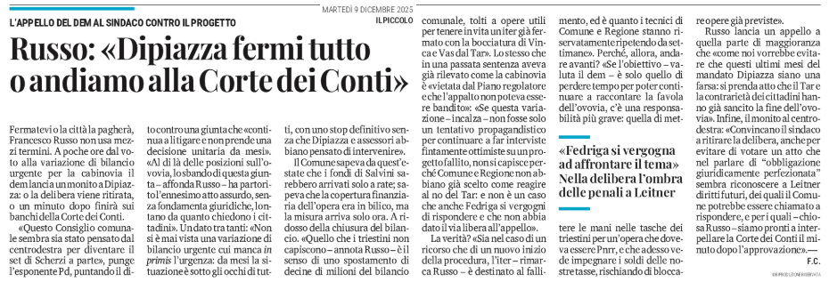 Russo: «Dipiazza fermi tutto o andiamo alla Corte dei Conti» - L'appello del dem al sindaco contro il progetto