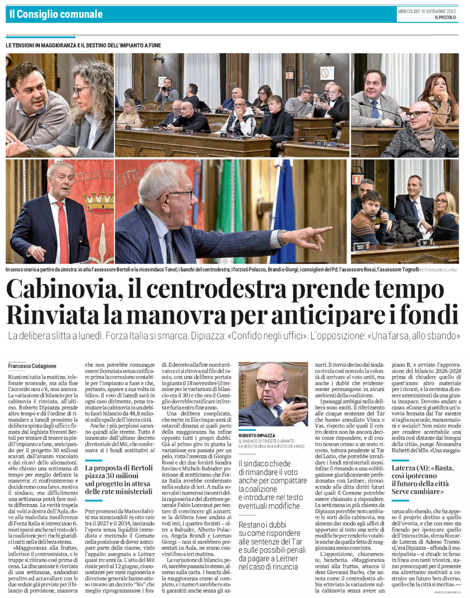 Cabinovia, il centrodestra prende tempo - Rinviata la manovra per anticipare i fondi - le tensioni in maggioranza e il destino dell'impianto a fune