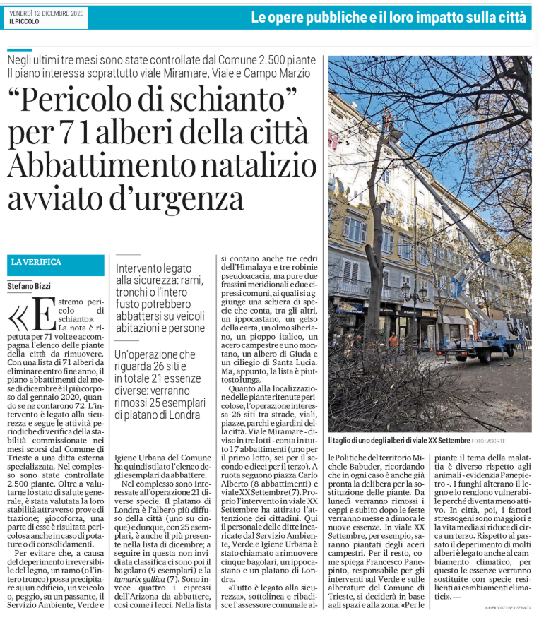 Negli ultimi tre mesi sono state controllate dal Comune 2.500 piante. Il piano interessa soprattutto viale Miramare, Viale e Campo Marzio