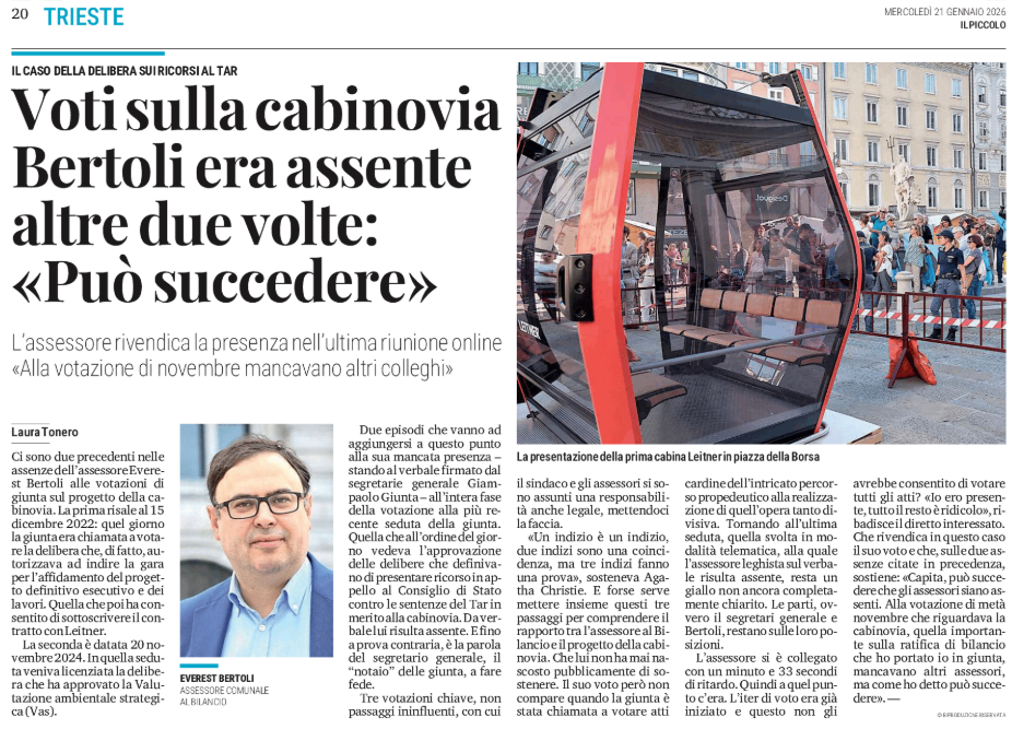 IL CASO DELLA DELIBERA SUI RICORSI AL TAR - Voti sulla cabinovia - Bertoli era assente altre due volte "Può succedere"