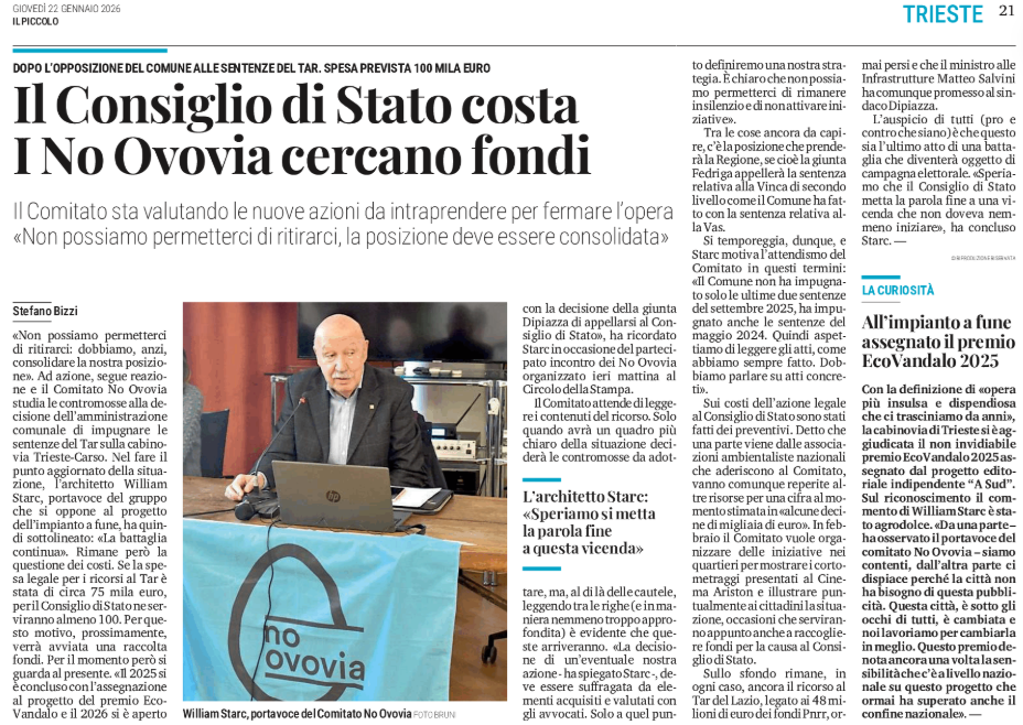 Il Consiglio di Stato costa - I No Ovovia cercano fondi - All'impianto a fune assegnato il premio EcoVandalo 2025