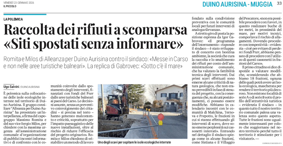 DUINO AURISINA - Raccolta dei rifiuti a scomparsa «Siti spostati senza informare»