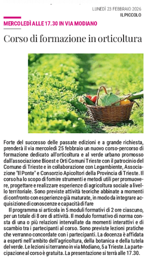 Corso di formazione in orticoltura - Mercoledì alle 17.30 in via Modiano.