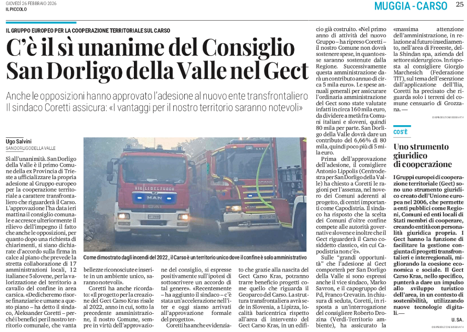 C'è il sì unanime del Consiglio San Dorligo della Valle nel Gect