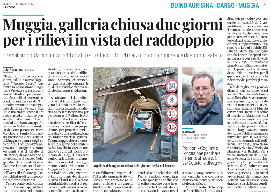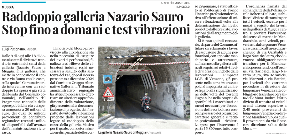 Muggia - Raddoppio galleria Nazario Sauro - Stop fino a domani e test vibrazioni
