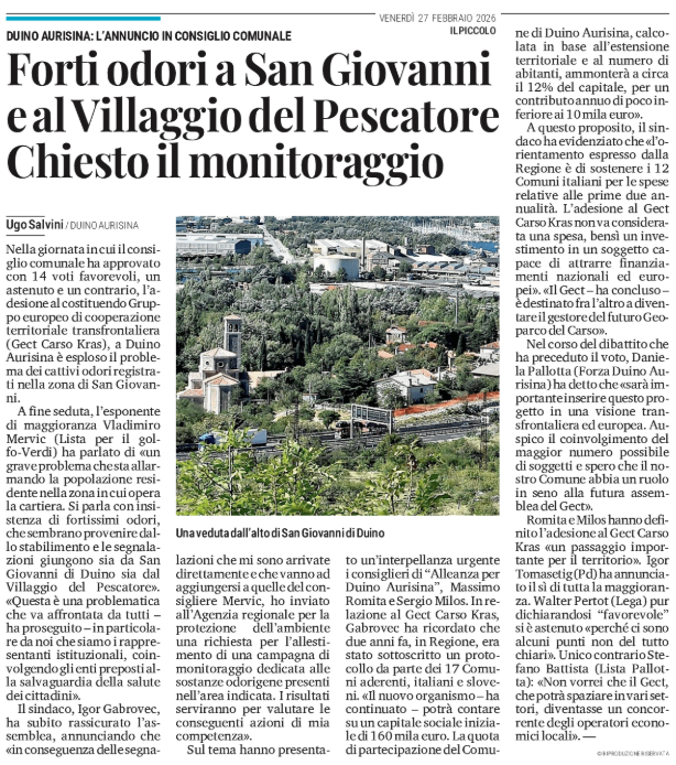 Duino Aurisina: l'annuncio in consiglio comunale - Forti odori a San Giovanni e al Villaggio del Pescatore - Chiesto il monitoraggio