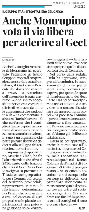 Anche Monrupino vota il via libera per aderire al Gect - il gruppo transfrontaliero del Carso