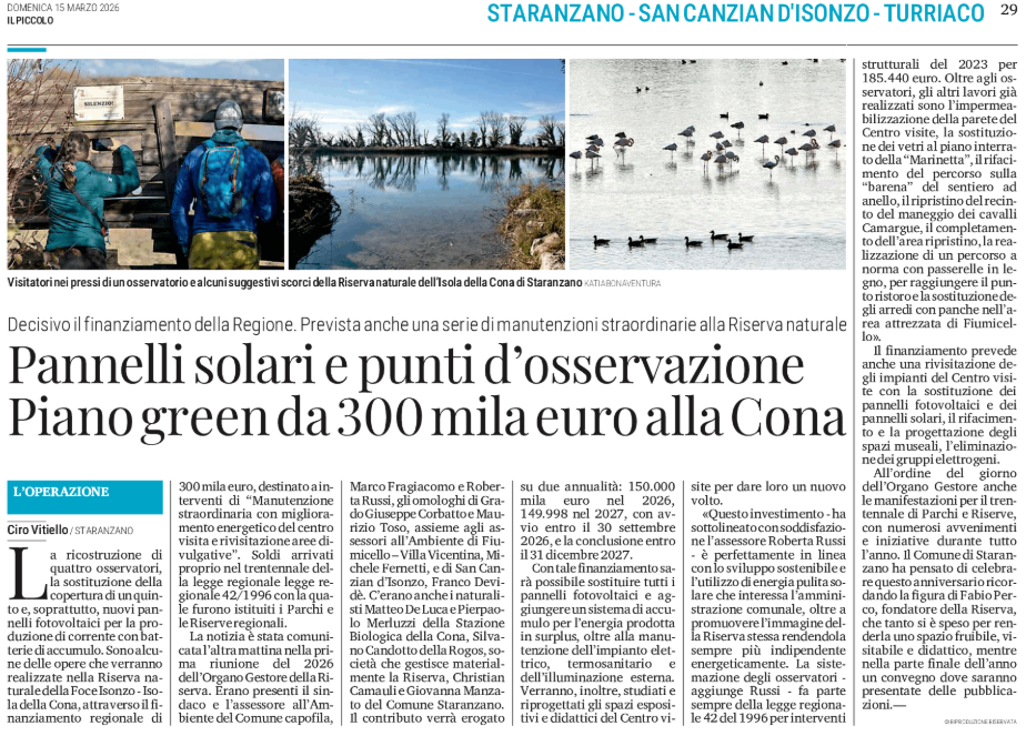 Pannelli solari e punti d'osservazione - Piano green da 300 mila euro alla Cona