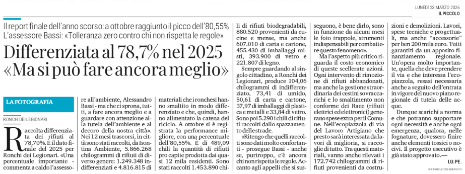 RONCHI DEI LEGIONARI - Differenziata al 78,7% nel 2025 «Ma si può fare ancora meglio»