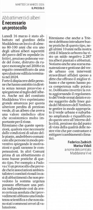 SEGNALAZIONI - Abbattimenti di alberi - E' necessario un protocollo - (Federico Zadnich, Marisa Vidali - a nome del comitato Maddalena Vive)