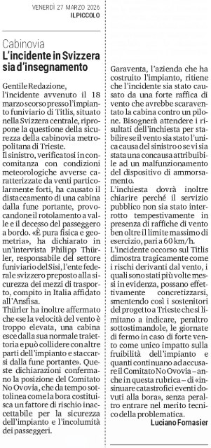SEGNALAZIONI - Cabinovia - L'incidente in Svizzera sia d'insegnamento - (Luciano Fornasier)