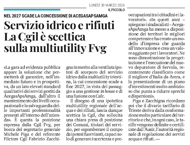 Servizio idrico e rifiuti - La Cgil è scettica sulla multiutility Fvg - Nel 2027 scade la concessione di AcegasApsAmga