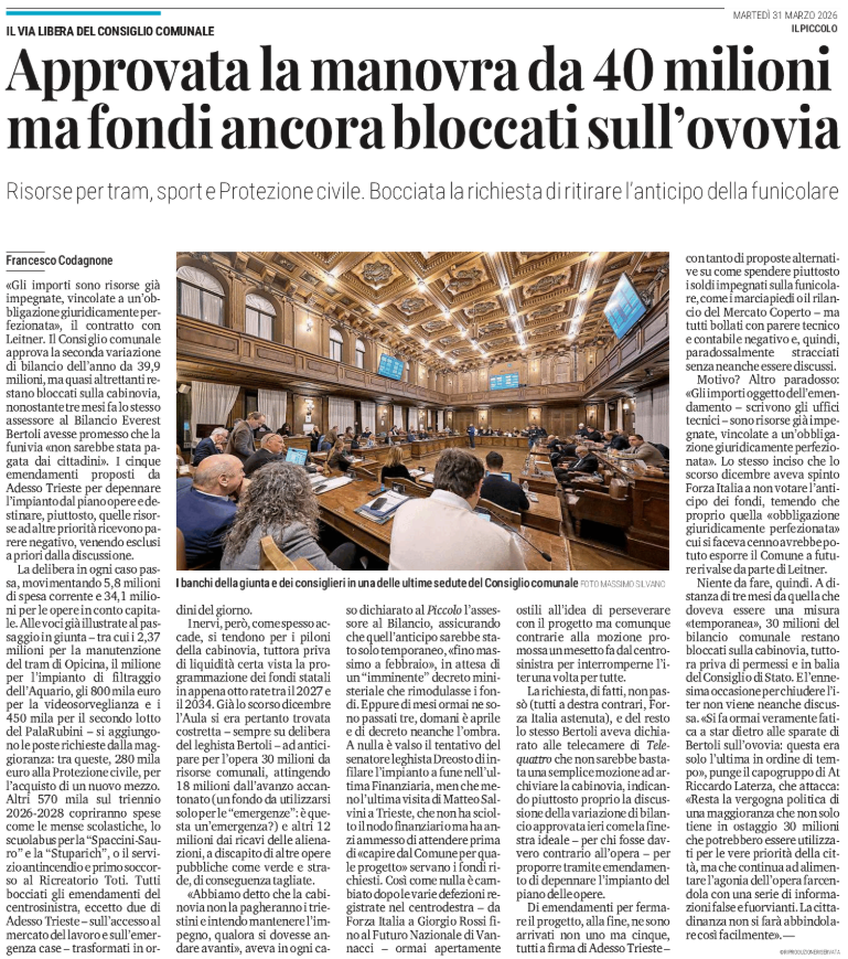 Approvata la manovra da 40 milioni ma fondi ancora bloccati sull'ovovia - il via libera del consiglio comunale