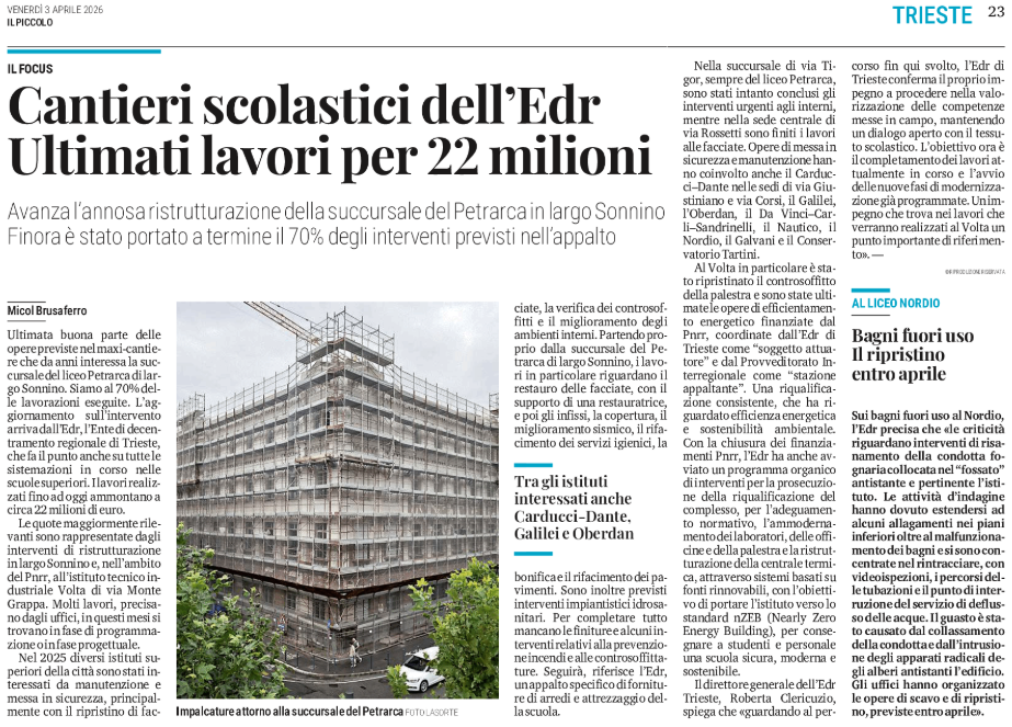 Cantieri scolastici dell'Edr - Ultimati lavori per 22 milioni